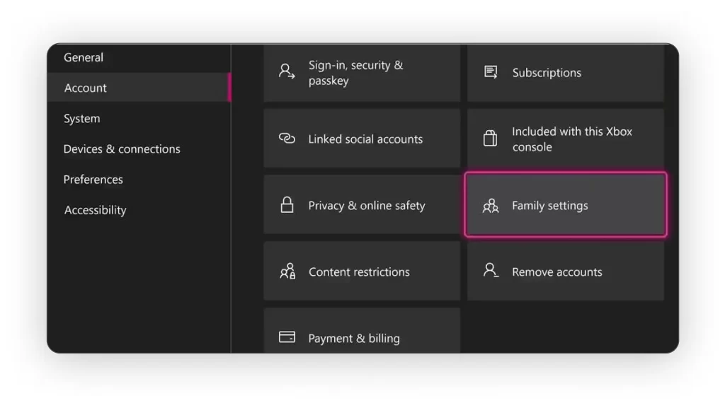 Step 1: On your Xbox console, sign in and navigate to Settings > Account > Family Settings.