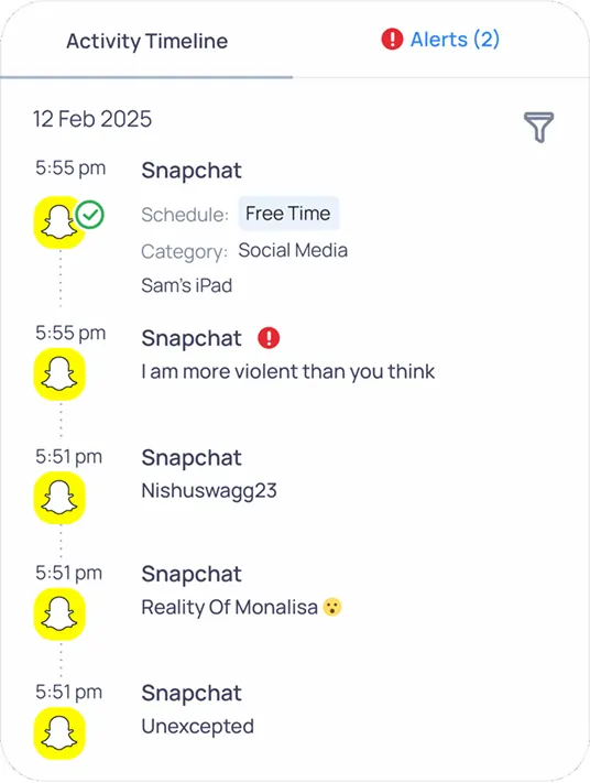 - Real-time activity tracking to provide parents insight into their child’s digital and online behavior, helping them spot potential risks early. Alerts notify parents if their child interacts with unknown contacts or views explicit content.